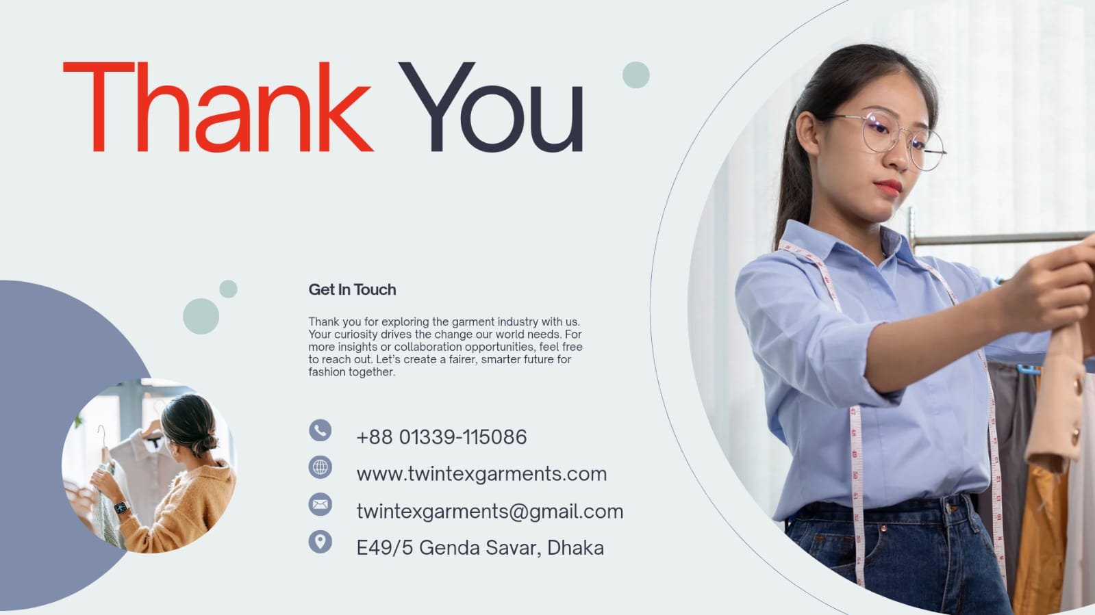 “TwinTex Garments"-এ আমরা প্রিমিয়াম কোয়ালিটির পোশাক তৈরি করি, যেখানে স্টাইল, কমফোর্ট ও টেকসই মানের নিশ্চয়তা রয়েছে। ডিজাইন থেকে শুরু করে প্রোডাকশন এবং শিপমেন্ট পর্যন্ত প্রতিটি ধাপ আমরা নিজস্ব তত্ত্বাবধানে সম্পন্ন করি। আমাদের লক্ষ্য হলো আধুনিক ফ্যাশনের সাথে সর্বোচ্চ মান ও গ্রাহক সন্তুষ্টি নিশ্চিত করা।